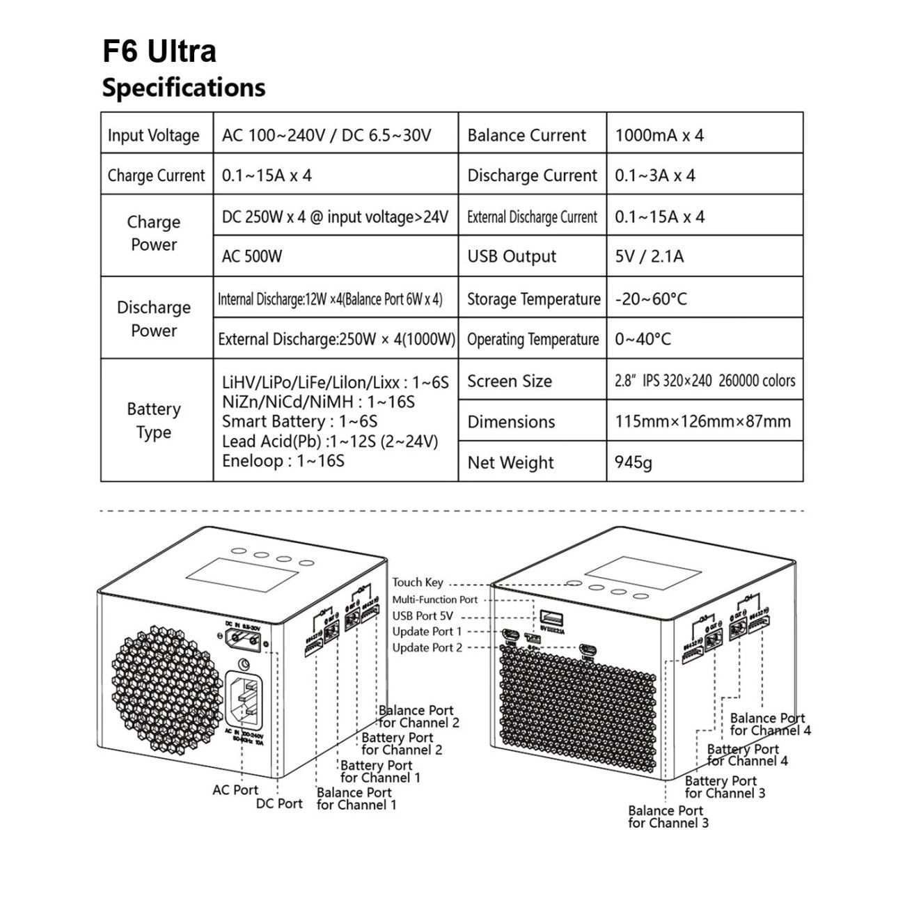 HOTA F6 Ultra 4 – це професійна багатоканальна зарядна станція, яка стане незамінним інструментом для пілотів дронів, FPV-ентузіастів та власників RC-моделей. Завдяки високій потужності, широкій сумісності та передовим функціям захисту цей пристрій забезпечує швидке й безпечне заряджання навіть у найінтенсивніших умовах експлуатації.