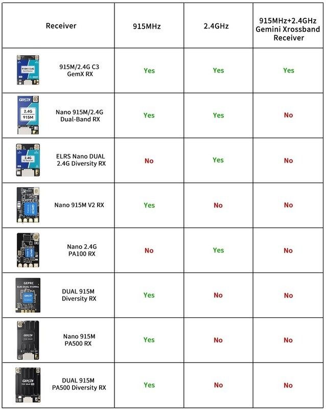 GemX Gemini підтримує частоту оновлення до 1000 Гц (FSK) і комплектується дводіапазонними антенами 915M/2,4 ГГц, що дозволяє гнучко перемикатися між режимами 915M Gemini, 2.4G Gemini і 915M+2,4G Dual-Band (для цього потрібно використовувати GemX TX). При роботі в дводіапазонному режимі система досягає підвищеної стійкості до перешкод і більш стабільного з'єднання, забезпечуючи відмінні результати як для гонок на близьких дистанціях, так і для польотів на великі відстані. Вона також повністю сумісна з однодіапазонними модулями ELRS TX, пропонуючи виняткову універсальність.