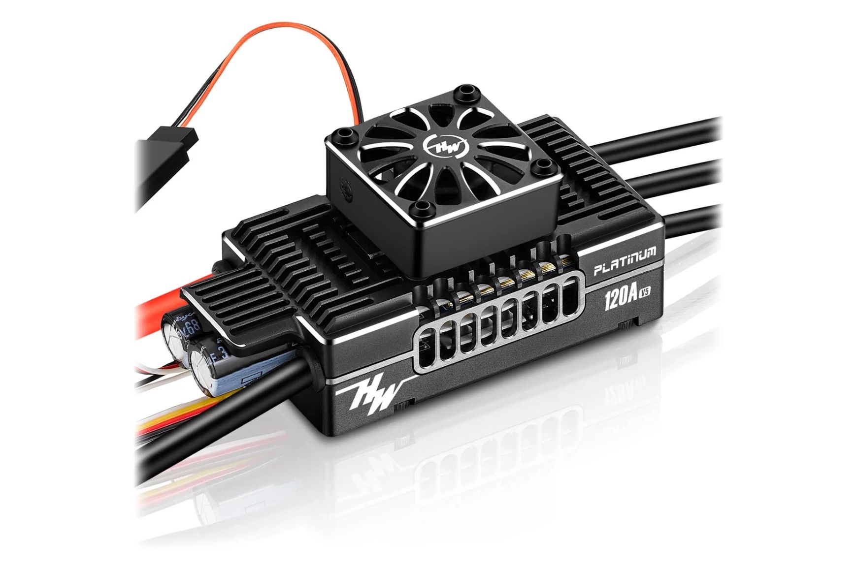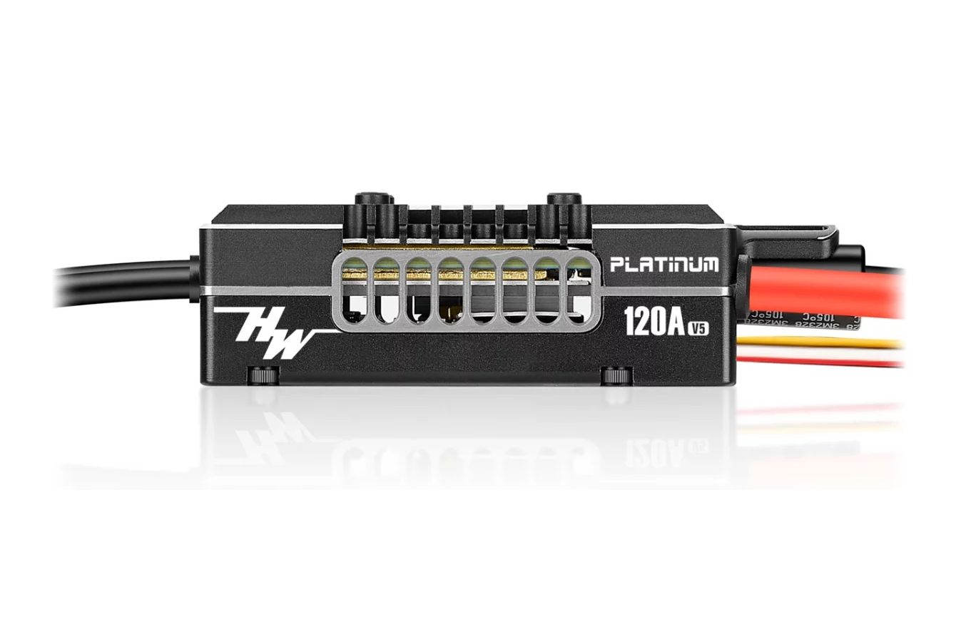 Спеціальна конструкція також покращує циркуляцію повітря, щоб робоча температура не досягала критичного рівня. Відкрита конструкція Platinum 120A V5 ESC одразу кидається в око. Додаткове використання термострічки та ще одного радіатора всередині подовжує термін служби та покращує розсіювання тепла на чутливих зовнішніх конденсаторах.