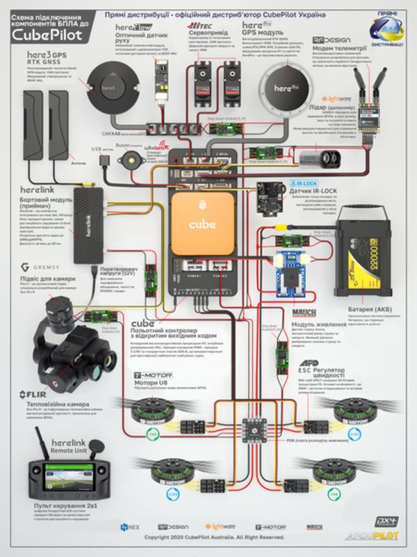 Сумісний модуль живлення Power Brick Mini для Pixhawk 2.1. Дозволяє одночасно живити бортовий контролер Pixhawk 2.1 і аналоги стабілізованою напругою 5В, а також передавати на бортовий контролер інформацію про напругу батареї і споживаний силовою установкою струм. Підтримує батареї до 8S.