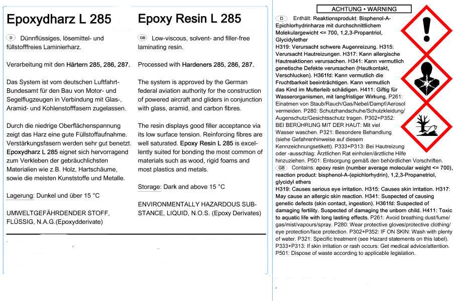 Використання смоли L 285 разом з отверджувачем 285 одобрено для авіаційної сфери, наприклад, для виробництва та ремонту планерів.