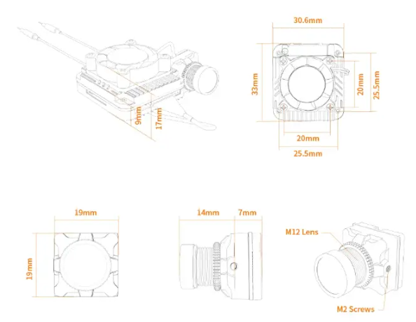 - Розміри модуля об'єктива: 19×19 мм, об'єктив M12, кабель 130 мм