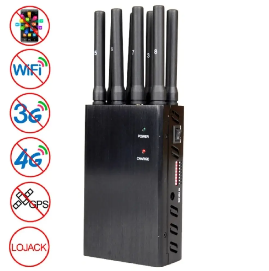 Потужний портативний багатодіапазонний подавлювач радіосигналів (8 каналів) — компактний переносний пристрій для блокування бездротових сигналів у визначеному радіусі. Підтримує одночасно придушення кількох популярних стандартів зв'язку, зокрема мобільних мереж, Wi-Fi та навігаційних систем.