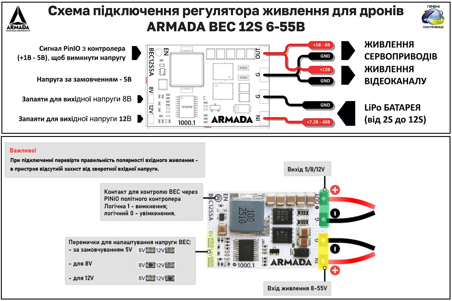 Імпульсний UBEC - понижувальний DC-DC стабілізатор напруги. Вихідна напруга UBEC має три пресетних варіанти 5В, 8В та 12В, що передбачає використання бека для живлення різних функціональних блоків дрона. Регулятор напруги перетворює високу напругу акумулятора (6–55 В) у стабільні 5 В, 8 В або 12 В, забезпечуючи чисте живлення без пульсацій. ARMADA BEC забезпечує постійний рівень напруги, навіть коли напруга на акумуляторі падає під час навантаження чи розряду. Це критично для стабільної роботи контролерів, щоб уникнути зависань або втрати зв’язку. Вибір вихідної напруги дає гнучкість: можна живити як контролер, приймач на 5 В, так і сервоприводи або камеру на 8–12 В.