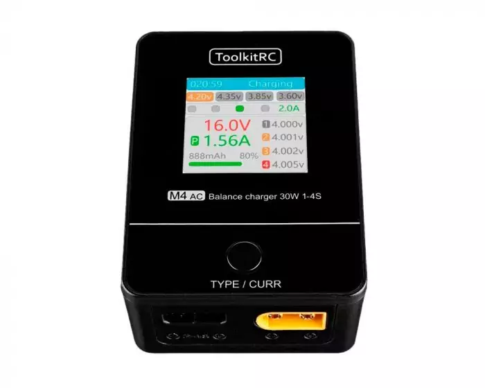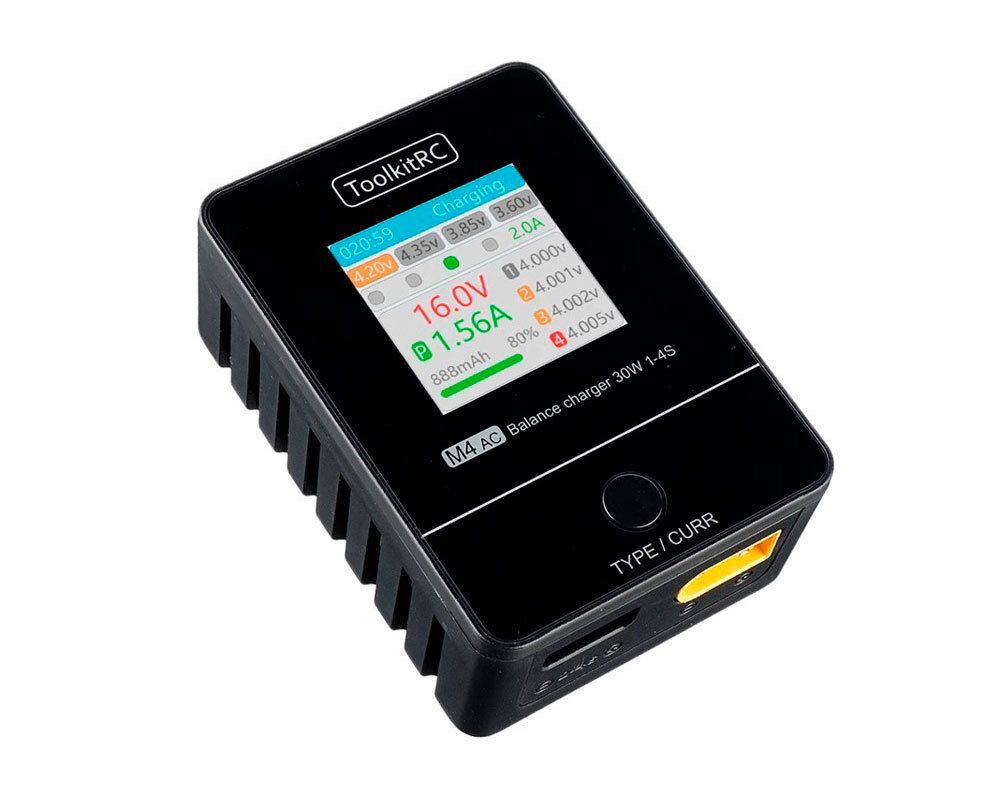 ToolkitRC M4AC 30W - це компактний високопродуктивний зарядний пристрій для заряджання та балансування літієвих батарей 1-4S. Зарядка поставляється з 32-бітним ARM процесором, який забезпечує більш точне балансування <0,005V. Порівняно з аналогічними бюджетними зарядними пристроями на ринку, потужність M4AC вища на 60%. ToolkitRC M4AC оснащений IPS-дисплеєм з широким кутом огляду, який відображає найбільш важливу інформацію: напруга, струм, стан зарядки та ін. Просте меню, легкість використання, малий розмір.